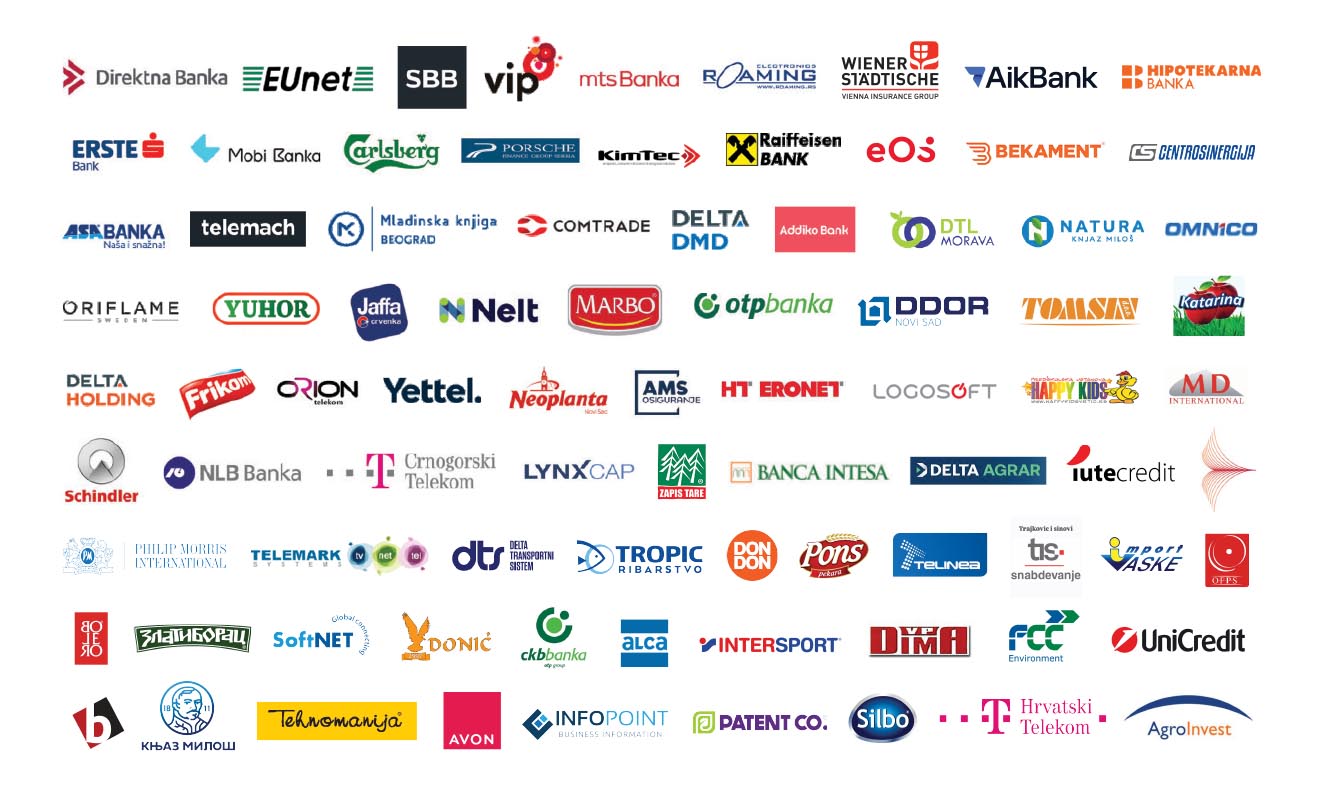Lista naših klijenata uključuje renomirane poslovne banke, investicione fondove, kompanije iz oblasti telekomunikacija, kao i kompanije iz raznih drugih oblasti i industrija.